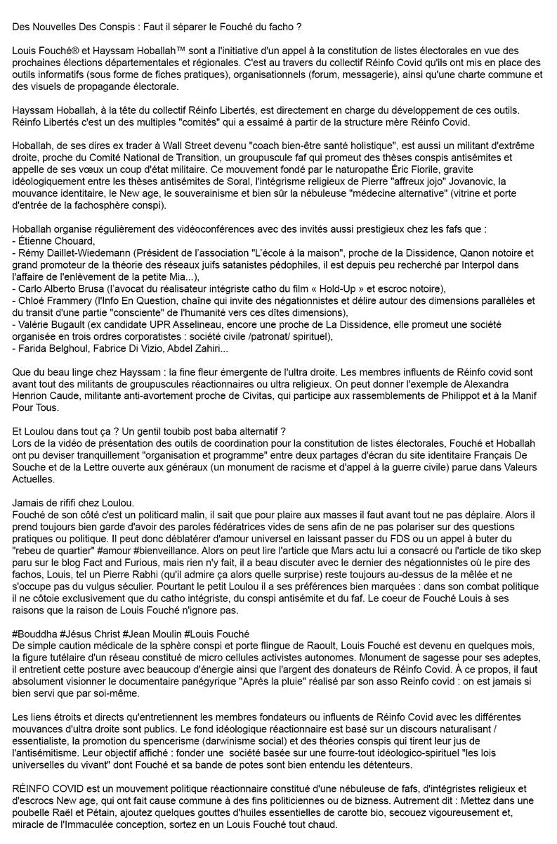 Aug 09, 2021 · louis fouché est également à l'initiative, avec hayssam hoballah, de listes intitulées « un nôtre monde » pour les élections régionales de 2021. May 29, 2021 · sous la bannière « un nôtre monde », une liste lancée notamment par le médecin marseillais comprend de nombreux candidats peu connus de la politique locale, et de nombreuses ramifications. Le médecin louis fouché est aujourd'hui au centre de la galaxy fake news. Lawyers, intellectuals and journalists, the Le 6 mars 2021, hayssam hoballah organise un entretien entre louis fouché et jean robin.